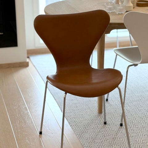 Fritz Hansen Syveren stoler designet av Arne Jacobsen. Alle originale fra 60- tallet. Noen skader i treverket noen steder, se bilder. Den ene stolen har litt svikt i ryggen, ellers er alle fine i ryggen. En stol mangler gummiknotter under setet.
