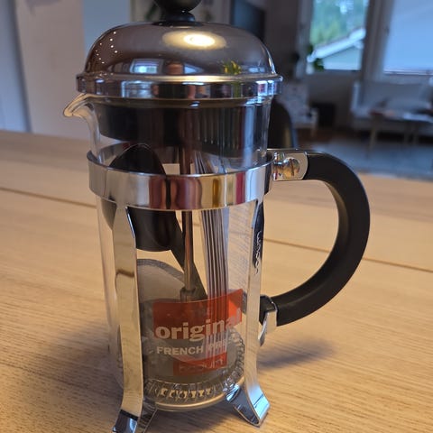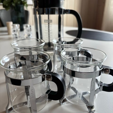 Selger dette fine settet fra Bodum med presskanne og 6 tilhørende kopper!☺️ Pent brukt, ingen skader. Men kan trenge en liten vask, da det har stått lenge ubrukt i skapet😅