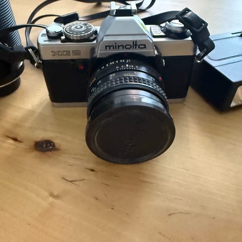 Minolta X-300 speilreflekskamera i svart med Minolta MD Zoom 35–70mm f/3.5 objektiv. Kameraet er et analogt 35mm SLR-hus med utskiftbar optikk og manuell fokus. Objektivet dekker brennviddene 35–70mm og har lysstyrke f/3.5 gjennom hele zoomområdet. Kameraet har toppmontert tilbehørssko for blits, remfester og ASA/ISO-tabell på bakdekselet. Passer til 35mm film og Minolta MD-fatning objektiver.