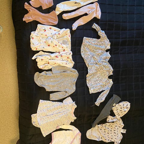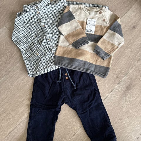 Jeans 30kr, jumper 30kr, body 20kr, hat 50kr, jacket 50kr, vest 50kr. 200kr for all.