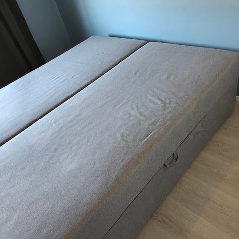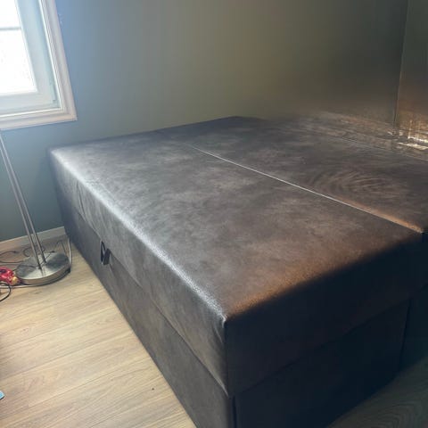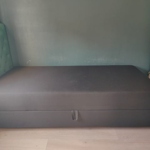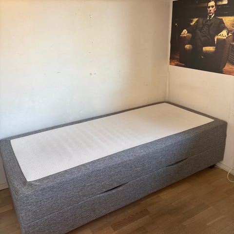 Jysk seng med oppbevaring. Sengen har en løftemekanisme som gir tilgang til et oppbevaringsrom under liggeflaten. Yttertrekket er i et ensfarget, mørkt tekstil. Egnet som enkeltseng i soverom, gjesterom eller hybel der det er behov for ekstra lagringsplass under sengen.