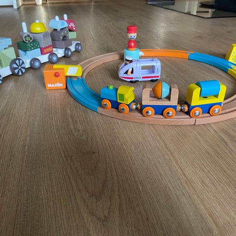 Fargerikt togsett i tre selges. Settet inneholder skinner, flere lokomotiver og vogner, samt ulike tilbehør. Leken er i god stand med solide tredeler og fine farger.