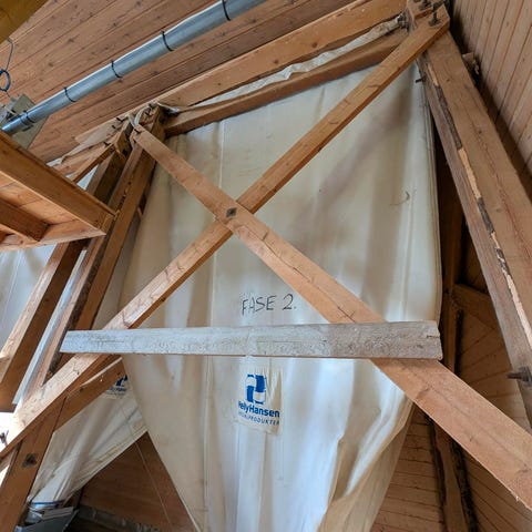 Siloen står innendørs på låve og har vært lagret tørt. Glassfiberen fremstår hel uten synlige sprekker. Egner seg godt til lagring av kraftfôr, korn, pellets eller lignende.