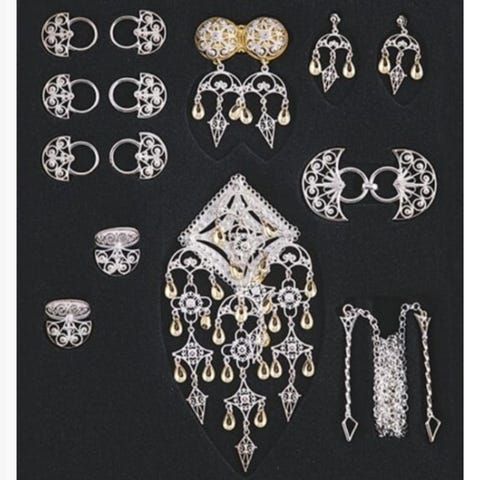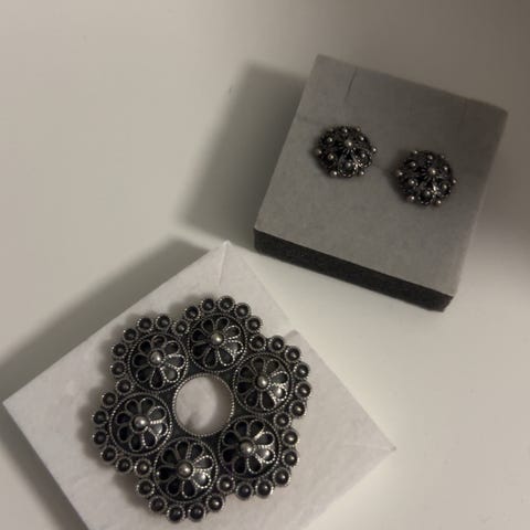 Splitter nytt sølje sett!🤍I dette settet får du en stor brystsølje, en halssølje, og to par ørepynt✨ Pluss fine oppevaringsesker