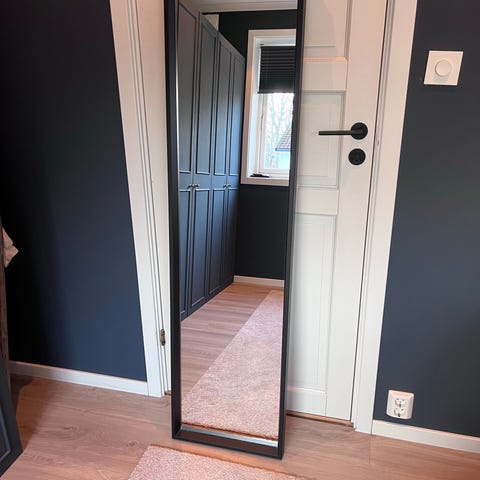 IKEA speil med svart ramme. Rektangulært helfigurspeil som kan henges på vegg eller plasseres stående mot vegg. Egnet til bruk i gang, soverom eller garderobe for helfigurspeiling og som interiørdetalj.