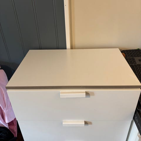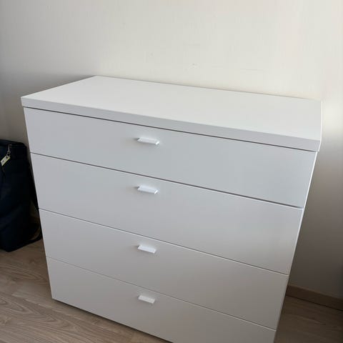 Praktisk og romslig hvit kommode med fem skuffer. Alt fungerer som det skal, og kommoden er i god brukt stand.