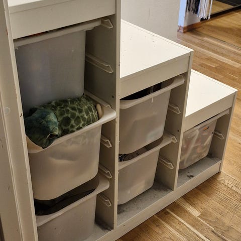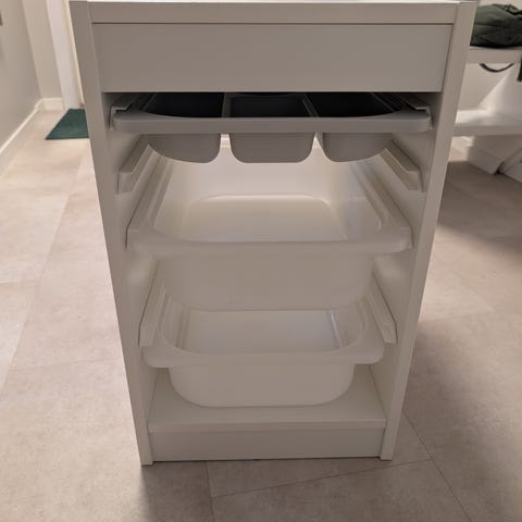 Praktisk hylle for barnerom, entré, eller annet, med romslige oppbevaringsbokser.