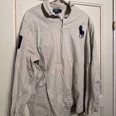 Ralph Lauren langermet genser for herre i størrelse XXL. Genseren er hvit og laget av tykk og god bomull. Den har krage med kort knappestolpe, brodert mørkeblå logo på brystet og forsterkede albuelapper og på skuldrene.