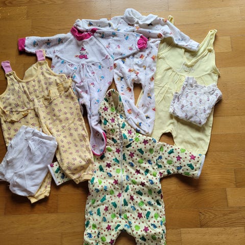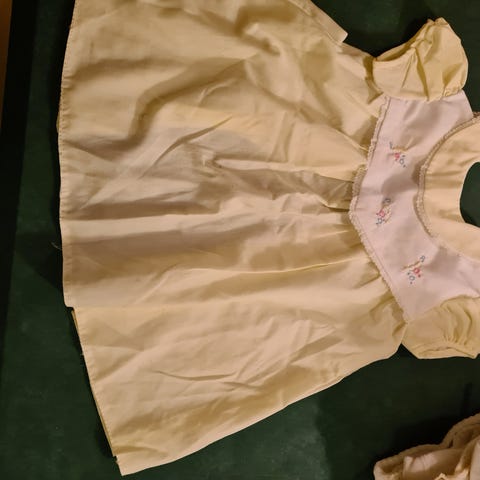 Skikkelig gamle babyklær, pent brukt vil tippe fra 60-80tallet en gang, litt usikker på nærmere årstall. Alle plaggene er hele og uten flekker såvidt jeg kan se. Noen av vaskelappene er godt utvasket. Mange av plaggene tåler kokvask.
