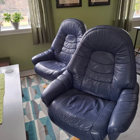 Forskjellige stoler en skinnstol med støtte til bena i svart skinn, pluss diverse andre små stoler. Første til mølla