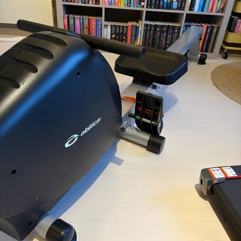 romaskin med display i svart og sølv. Maskinen har fotpedaler med justerbare stropper, sete som glir på skinne og håndtak med rett grep. Innebygd treningscomputer viser grunnleggende treningsdata som tid, antall rodrag og andre relevante måleverdier. Egnet for innendørs rotrening hjemme. Romaskinen har kompakt design som passer på treningsrom eller i andre tilgjengelige rom i boligen.