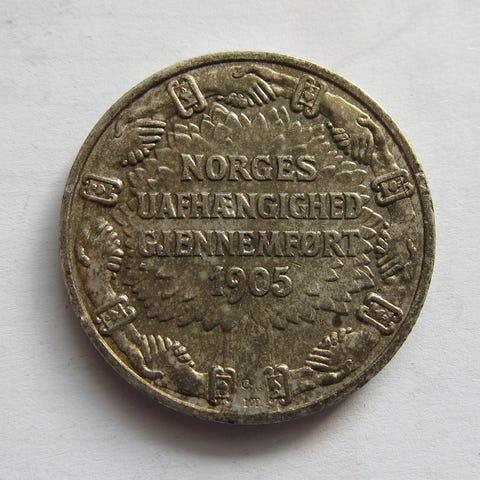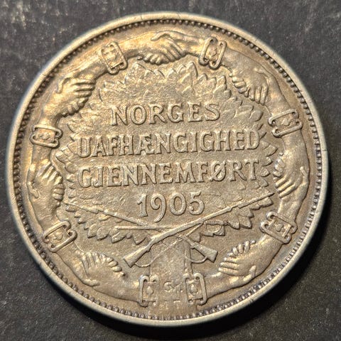 Flott norsk 2 kroner mynt fra 1907 i sølv. Minnemynth med teksten «Norges uafhængighed gjennemført 1905». https://norgesmynter.no/produkt/unionsopplosningen-lite-skjold/