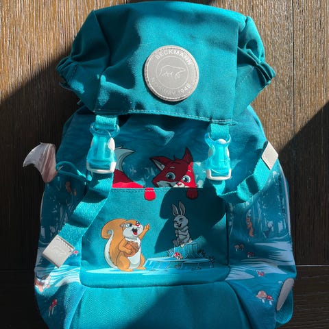 Kjempe fin barnehagesekk fra Beckman. Sekken er godt brukt, men er likevel fortsatt fin og har mye bruk igjen. Søtt print med rev og er grønnlig på farge.