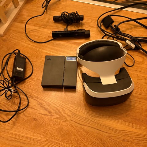 Sony PlayStation VR brille med tilhørende prosessorenhet, kamera og to PlayStation VR . Settet inkluderer VR-headset, kontrollere, ekstern prosessorboks med HDMI og USB-tilkoblinger, kamera.
