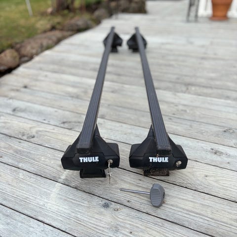 Har også et sett Thule Wing Bar Evo 127 stativ med Thule Evo Clamp fotsett. Usikker på hvilke bilmerke det har vært benyttet på, men "gummiklossene" på fotsettet er merket med 452 og 453 foran, og 454 på begge sider bak. Jeg har ikke nøkler til dette settet, men dekslene er åpne. Hentepris kr 700,-.