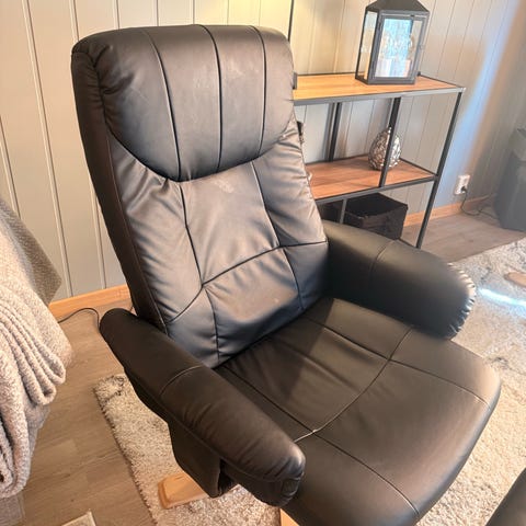 Selger to sorte lenestoler i imitert skinn.