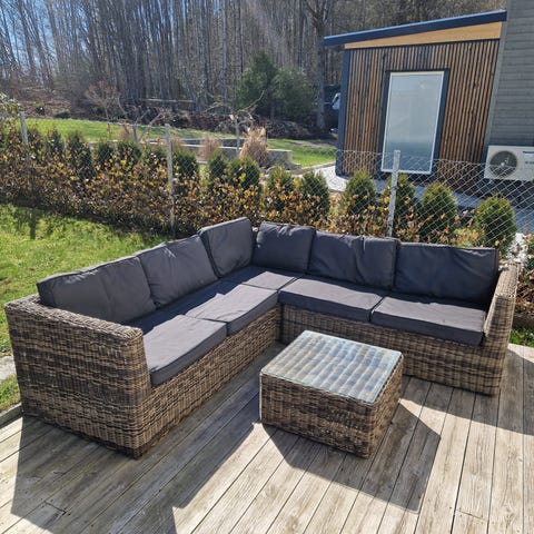 Hjørnesofa med bord hagemøbelsett i kunstrotting. Settet består av en L-formet hjørnesofa og et rektangulært bord med glassplate.