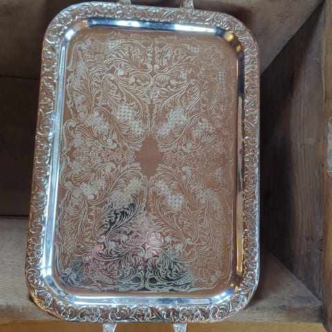 Mål: 40 cm x 28 cm. Materiale: Sølvplett (Silver Plate). Opprinnelse: Produsert i England. Tilstand: Fatet er i god stand strukturelt, men har to synlige striper i bunnen (se bilder). Prisen er derfor satt betydelig lavere enn normalt for denne typen fat.