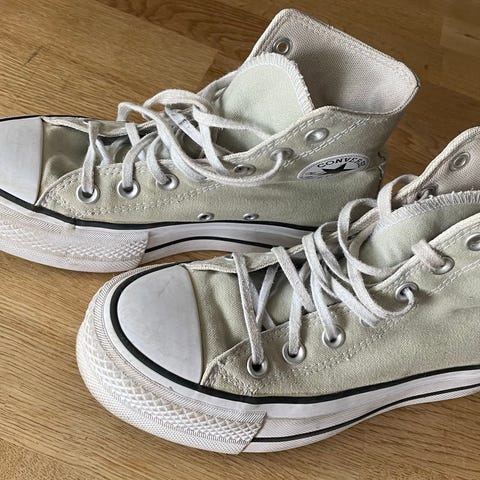 Converse sneakers i høyt skaft i størrelse 39. Skoene har overdel i lys canvas med lisser foran og gummitå. Yttersåle i gummi med mønster for grep. Modellen passer til hverdagsbruk og fritid. Unisex-modell som kan brukes av både kvinner og menn.