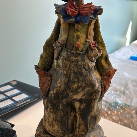 Keramikk klovn av kunstner Anne Marie Erga. Skulpturen har stor rund kropp med grønne prikker, stor gul sløyfe og rød nese. Veldig fin.