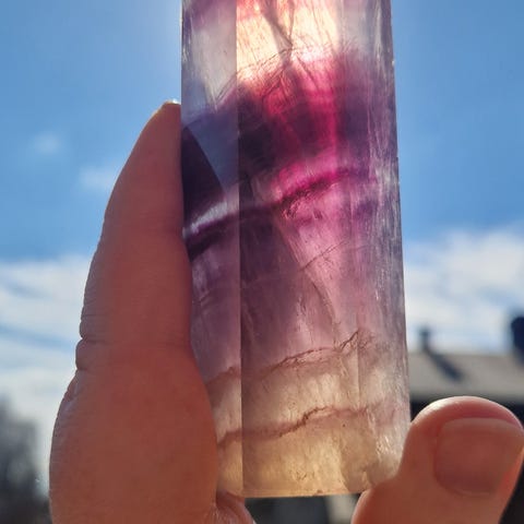 Denne fluoritt friformen er så nydelige, med den innvokste micaen som lager helt nydelige indre trekantede regnbuemønstre og/eller andre regnbuer. Denne herlige friformen med striper av magenta og lys grønt, har store felt med egnbuer inne i stenen på begge sider, samt små regnbuer her og der. På den ene enden har den et kvitaktig slør, som lager litt regnbueskimmer. Nydelig vakkert indre lysspråk og glød i solen. Poleringen er flott! Vekt 104 gram.