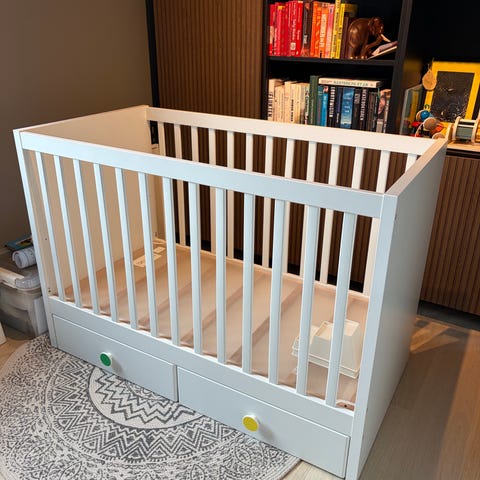 IKEA lekegrind i hvit farge. Rektangulær grind med sprosser på alle sider og åpen topp. Egnet som lekeområde for små barn innendørs. Kan plasseres fritt i rommet. Leveres uten madrass og leker dersom ikke annet er oppgitt i annonsen.