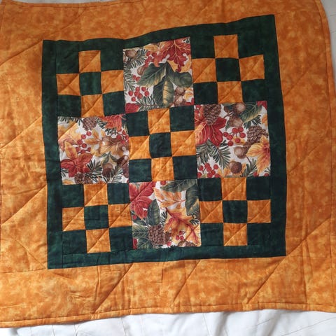 Hjemmelaget duk i lappeteknikk.