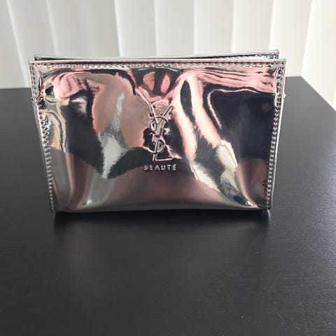 Selger en lekker rød sminke pung/clutch fra Yves Saint Laurent (YSL). Vesken har den ikoniske gul logoen foran og praktisk glidelås lukking.