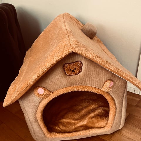 Pent brukt av liten hund. Vasket etter bruk av hund. Katten som jeg har nå har ikke vært interessert i å ligge i den.