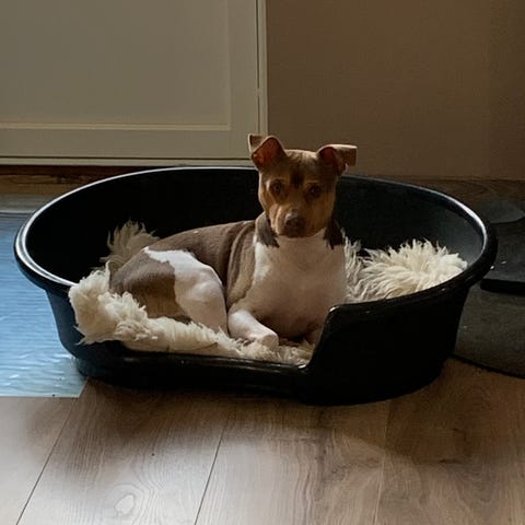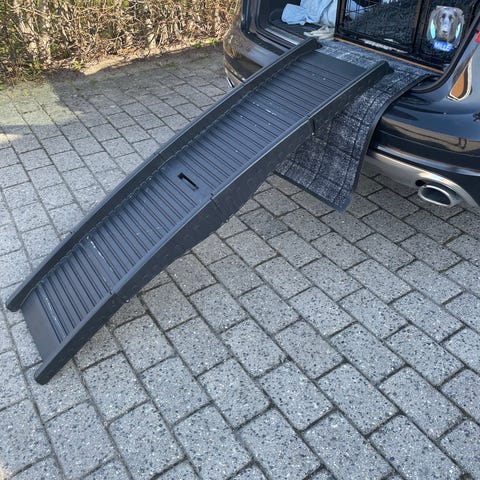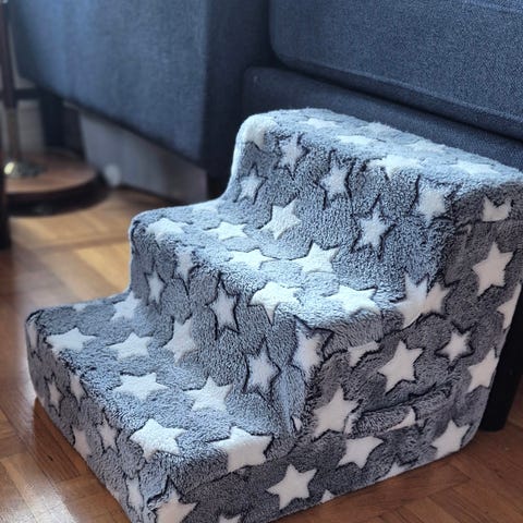 Trappen er polstret og trukket i mykt tekstil, som gir et behagelig underlag for hunden. Den består av fire brede trinn som gjør det enklere for mindre eller eldre hunder å komme seg opp i sofa, seng eller til vinduskarm.