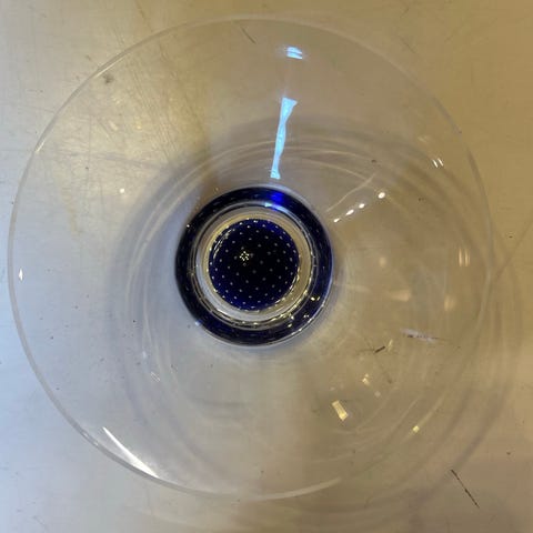 Selger en tung og massiv skål i vakkert koboltblått kunstglass. Skålen har de karakteristiske "slørene" eller virvlene i glassmassen som er typisk for svensk glasskunst.