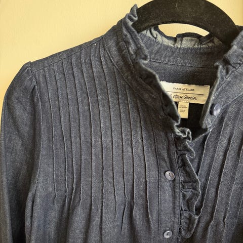 & Other Stories Paris Atelier hverdagskjole i blå denim, størrelse 34. Kjolen har løs passform med rynkedetaljer foran og bak, samt lange ermer med volangkant ved mansjettene. Laget i denimstoff med synlige sømmer som gir strukturert uttrykk. Passer som hverdagskjole eller til en enkel, avslappet stil.