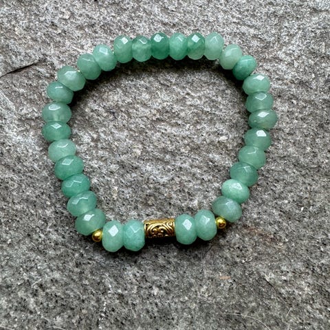 Armbånd av lysegrønn stein og sølvfargete detaljer. Elastisk. Fra Nora.