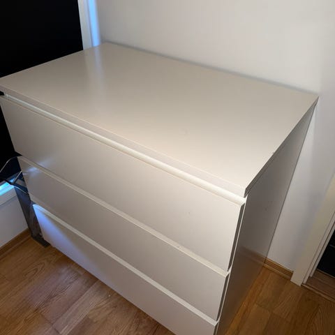 Kommoden er malt i grå farge. Fire skuffer. Noen bruksmerker.