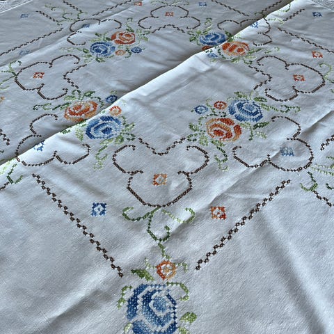 Vintage duk med blondekant og broderier i svart og hvitt