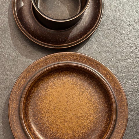 Arabia Ruska tallerkener i steingods. Tallerkenene har lys beige innside med mørk brun glasur langs kanten og en mørk ring mot midten. Egnet som middagstallerkener eller serveringstallerkener i hverdagsbruk eller til borddekking i samme serie.