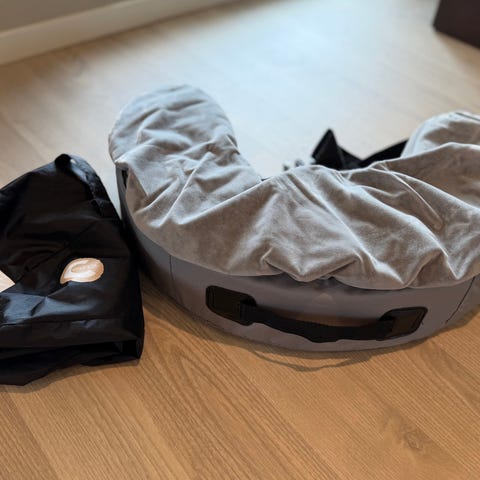Najell SleepCarrier Volume 2 i grått. Brukt primært som babynest og i vogn, men kan også åpnes som liggeunderlag/leketeppe.
