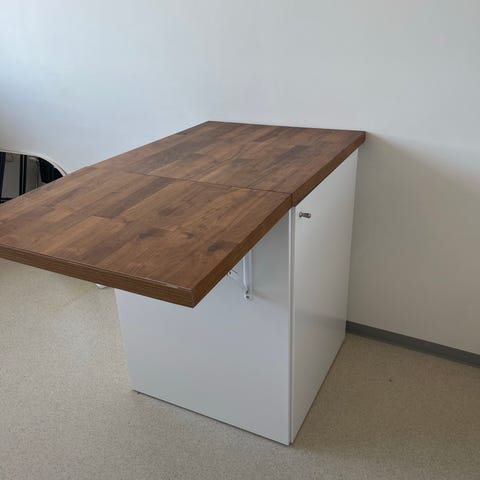 Kjøkkenøya står på hjul som kan låses, slik at den enkelt kan flyttes ved behov, men står stabilt når hjulene låses.
