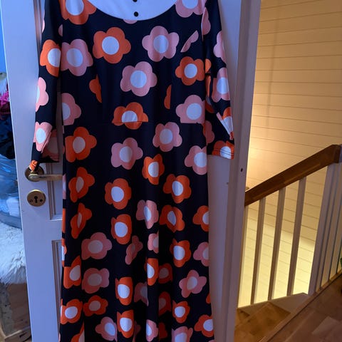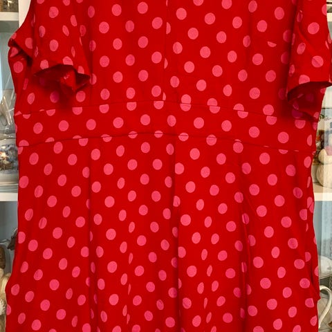 KO:KO Jane hverdagskjole for dame i størrelse 38. Kjolen er rosa med store prikker og har knyting i halsen. Lengden er midi til lang, med 3/4-ermer. Materialet er 95 % bomull og 5 % elastan, som gir et mykt og lett elastisk stoff. Egnet som hverdagskjole.