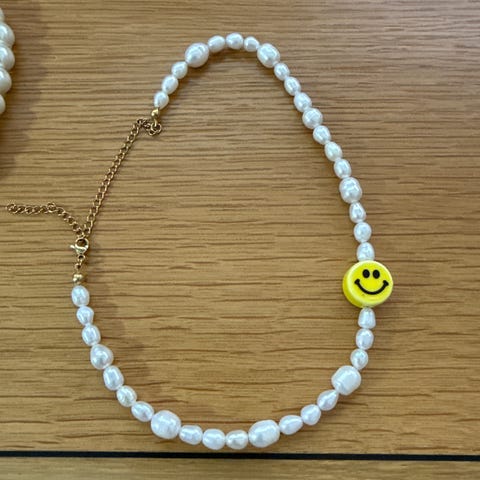 Perlehalskjede med “FAMOUS” bokstaver.
