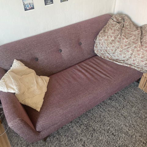 Fin sofa til barne rommet, et lite vann merke etter ett bløtt håndkle,