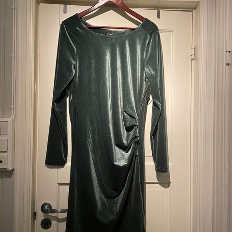 Pieces festkjole i grønn fløyel for dame i størrelse S. Kjolen har lange ermer og v-utringning. Materialet er mykt fløyel som gir en strukturert overflate. Passer til bruk ved formelle anledninger og festlige sammenkomster.