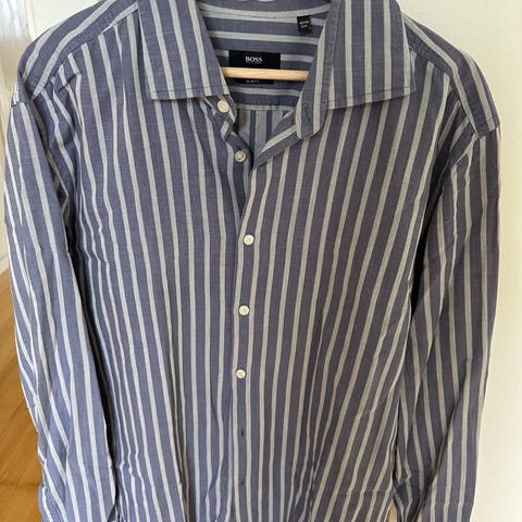 Pent brukt kortermet skjorte fra Hugo Boss i klassisk hvit farge. En stilren og tidløs skjorte som passer like godt til jobb, sommerdager eller mer avslappede antrekk.