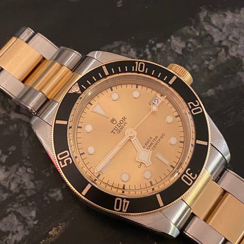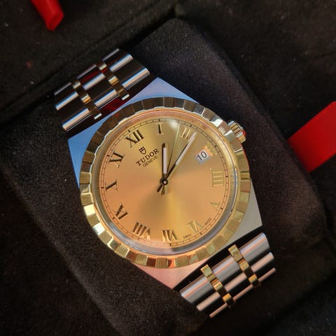 Tudor Day‑Date herreklokke med automatisk urverk. Klokken har gullfarget skive med. 41mm ref: 23013