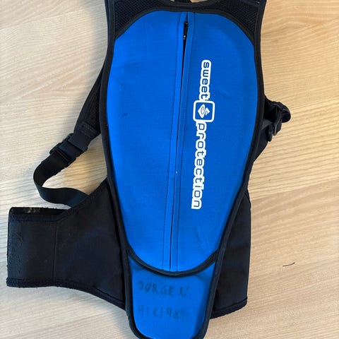 Sweet Protection ryggplage i størrelse S i svart farge. Modellen er utformet som en vest med skulderstropper og midjebelte for god passform og stabilitet. Baksiden har støtdempende plate og pustende mesh-materiale mot ryggen. Ryggskinnen er CE-godkjent i henhold til EN 1621-2 og beregnet for bruk ved aktiviteter som krever ryggbeskyttelse, for eksempel ski, snowboard eller sykling. Justerbare stropper gjør det mulig å tilpasse passformen til brukeren innenfor angitt høydeintervall på produktetiketten.