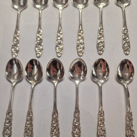Sett med teskjeer med dekorert skaft i sølvfarget metall. Skjeene har avrundet skjehode og et mønstret håndtak som gir et klassisk uttrykk. Egner seg til servering av te, kaffe, dessert eller andre varme og kalde drikker. Antall skjeer fremgår av bildet.