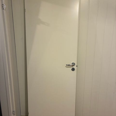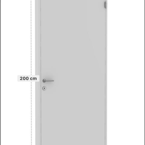 Hvit innerdør i standard, glatt utførelse. Døren har hull for dørhåndtak og låskasse. Egnet som romdør innendørs i bolig eller kontor. Materiale ser ut til å være malt tre eller trefiberplate. Nærmere mål og karm følger ikke av bildet og bør eventuelt oppgis av selger.
