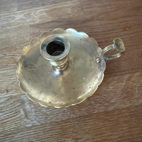 Fin lysestake i messing med håndtak, og fin pynt gravert inn. Lysestaken er 9 cm høy og foten er 13 cm i diameter under. Den er beregnet på på vanlig stearinlys.