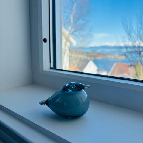 Glassfigur formet som en bjørn i hvitt glass med klare kanter og små svarte detaljer. Passer som dekorasjon i vinduskarm, på hylle eller bord. Egnet som interiørdetalj i stue, soverom eller kontor.
