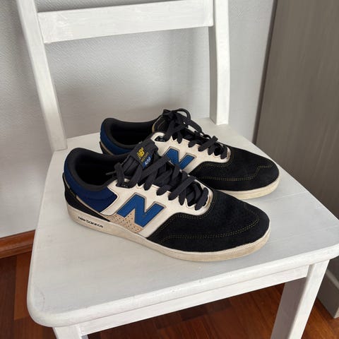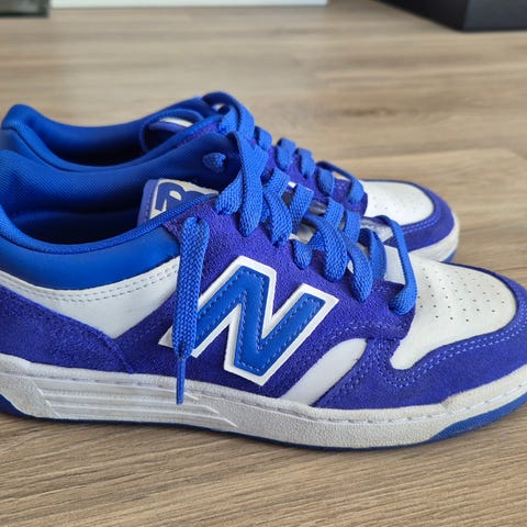 New Balance sneakers joggesko i størrelse 44,5. Modellen har overdel i tekstil og syntetisk materiale i blå og hvit farge, med snøring foran og karakteristisk New Balance-logo på siden. Yttersåle i gummi med mønster for grep. Passer som fritidssko og til hverdagsbruk.
